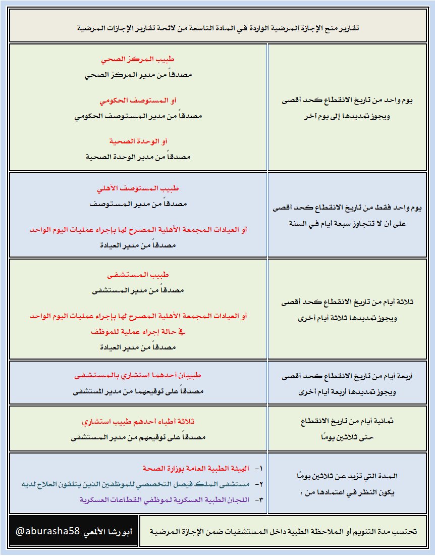 محمد أحمد الألمعي Pa Twitter جدول يوضح تقارير منح الإجازة المرضية الواردة في المادة التاسعة من لائحة تقارير الإجازات المرضية
